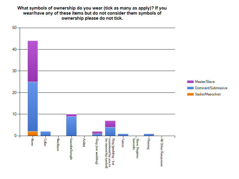 74 submissives answered this question. As a symbol of ownership, the collar came top. 68% of all the submissives that answered this question said they wore a collar. 80% of S/m submissive respondents wear a collar to show ownership (4 people). 60% (31 respondents) of D/s submissives said they wear a collar and 88% (15 answerers) of M/s submissives also said they wear a collar to signify ownership.