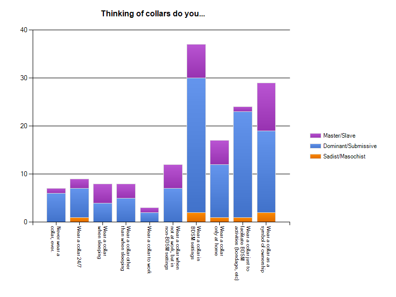 25% of masochists (Okay – one person) said they wear a collar all the time, compared to 12% and 13%, respectively, of submissives and slaves. This contrasts with those who wear a collar just for BDSM purposes – 25% of masochists, 45% of submissives and 7% (that’s just one person) of slaves do this.