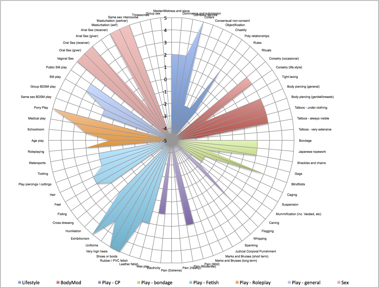 “You are certainly a very different woman from One” she said “Two, you are 24% kinky. Your lifestyle score was 16%. You were higher on play – 22% and highest on sex – 32%, even thought there are some things you won’t do. Why do you think you are here?”